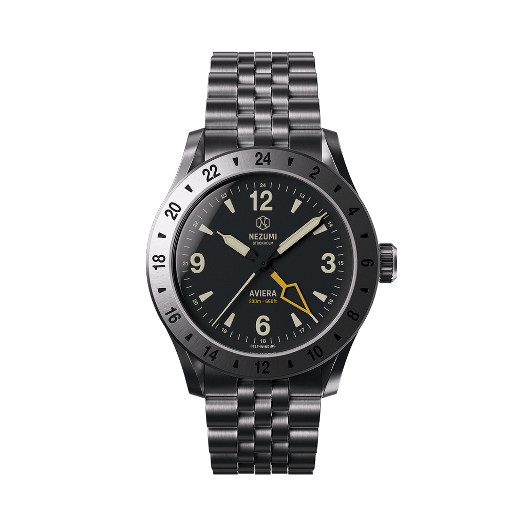 Assembled in Germany, the Aviera GMT ref. AA2.102 (2nd generation) by Nezumi features a 40mm brushed case, a fixed 24h bezel and is powered by the Miyota 9075 automatic GMT movement ticking at 28'800 vph/bph.